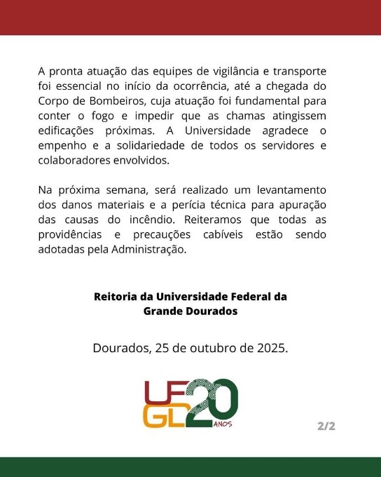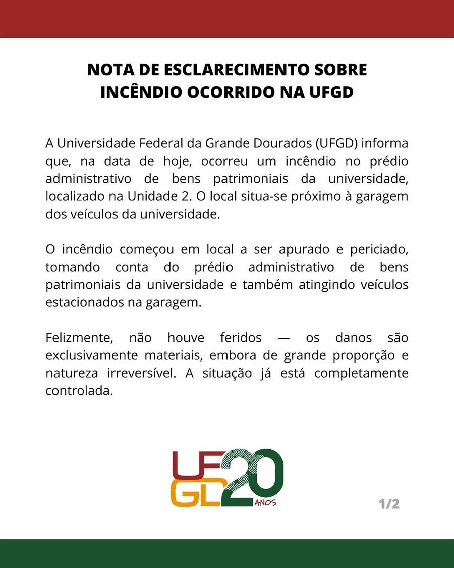 A Universidade Federal da Grande Dourados (UFGD) informa que, na data de hoje, ocorreu um incêndio no prédio administrativo de bens patrimoniais da universidade, localizado na Unidade 2.