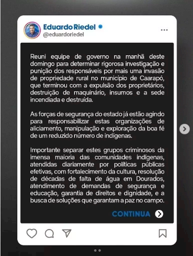 O governador afirmou que é importante separar os “grupos criminosos da imensa maioria das comunidades indígenas, atendidas por políticas públicas efetivas'. Riedel diz que não irá retroceder no combate efetivo “aos que alimentam o caos, criam dissensões, exploram a miséria'.