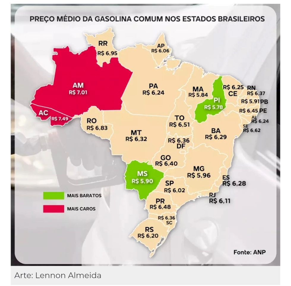 Na outra ponta do ranking, o Acre aparece com o preço mais alto do país, chegando a R$ 7,49 por litro, seguido pelo Amazonas (R$ 7,01) e por Roraima (R$ 6,95).