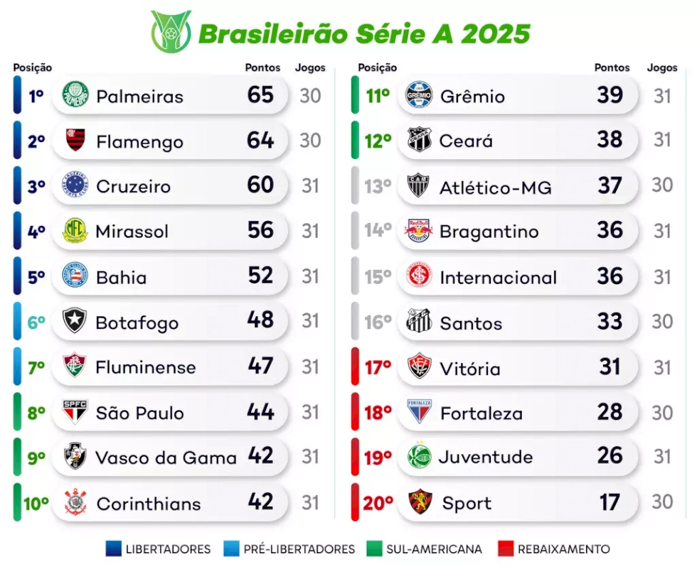 Outro destaque da rodada é o clássico entre Botafogo x Vasco, a partir das 18h30, no estádio Engenhão, no Rio de Janeiro. A rodada ainda contará com Sport x Juventude, Vitória x Internacional, Bragantino x Corinthians, Grêmio x Cruzeiro e Atlético-MG x Bahia.