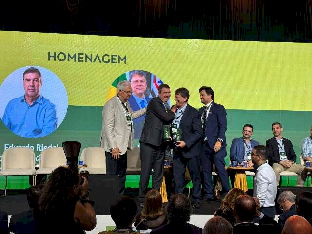 Durante o evento, Riedel também foi homenageado ao lado de Tarcísio, que elogiou o colega sul-mato-grossense, destacou sua atuação à frente do governo e afirmou ser “fã' do governador.